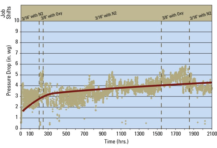 A. If you experience those job shifts of cutting typical 10-gauge sheet metal today and 6.35 mm / 1/4 in. or thicker plate steel tomorrow, the better recovery feature means a lot to you. PowerCore TG filter packs can handle the shift in dust loading better than any traditional filter cartridge because they can collect more dust and they are cleaned by the channeled pulse energy of the Zero-Turn Pulse Cleaning System. Therefore, PowerCore TG filter packs recover more easily than traditional filter cartridges from dramatic spikes in pressure drop during pulse cleaning. The result is longer filter life.